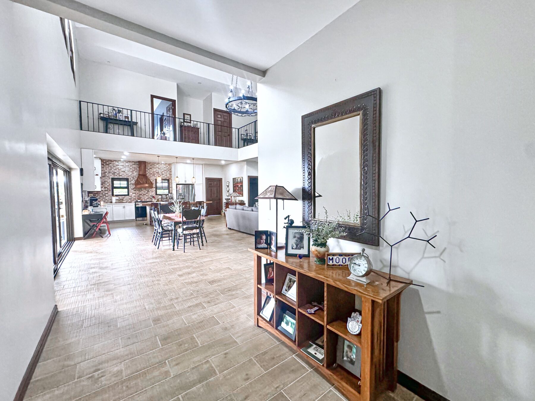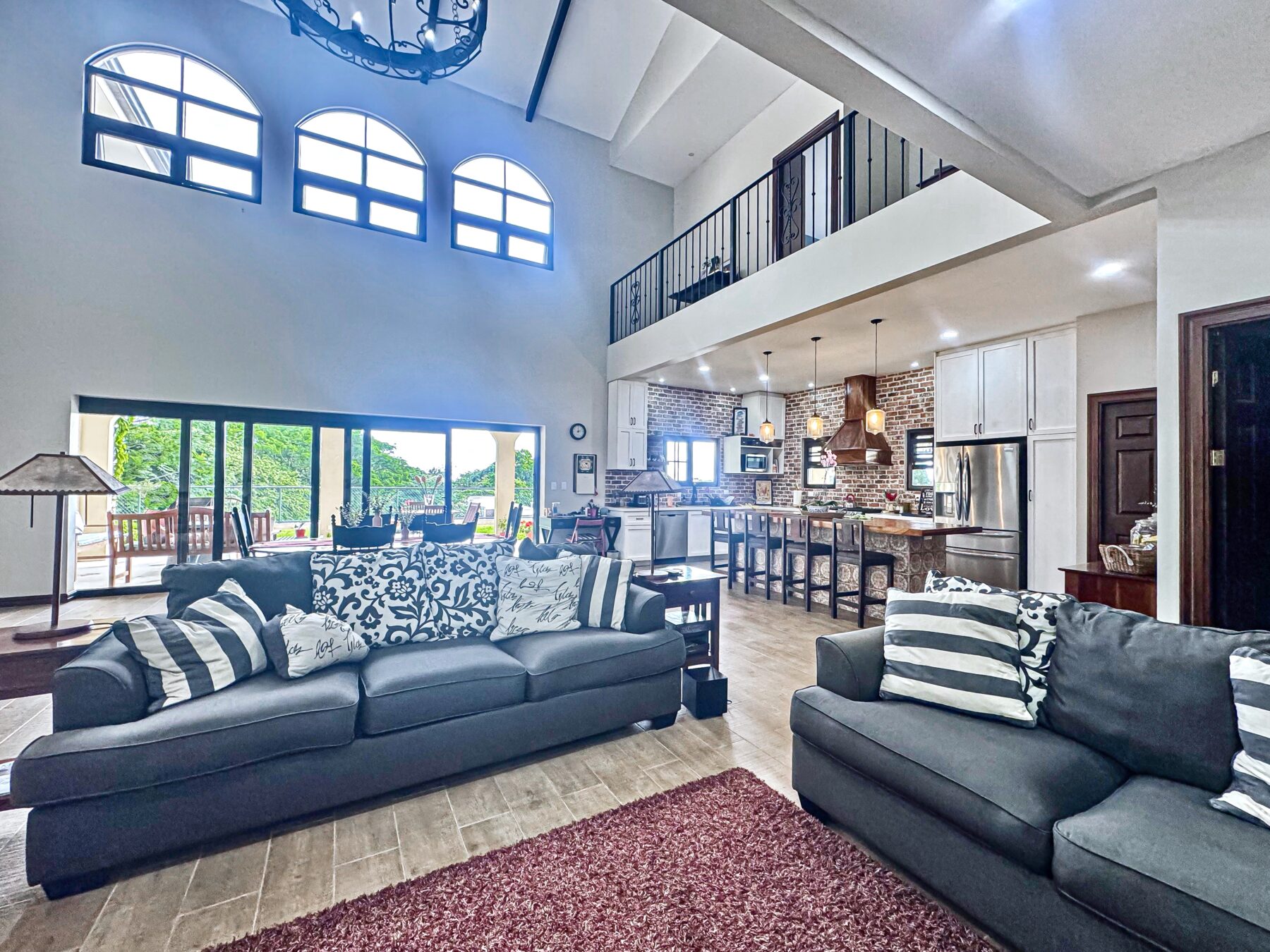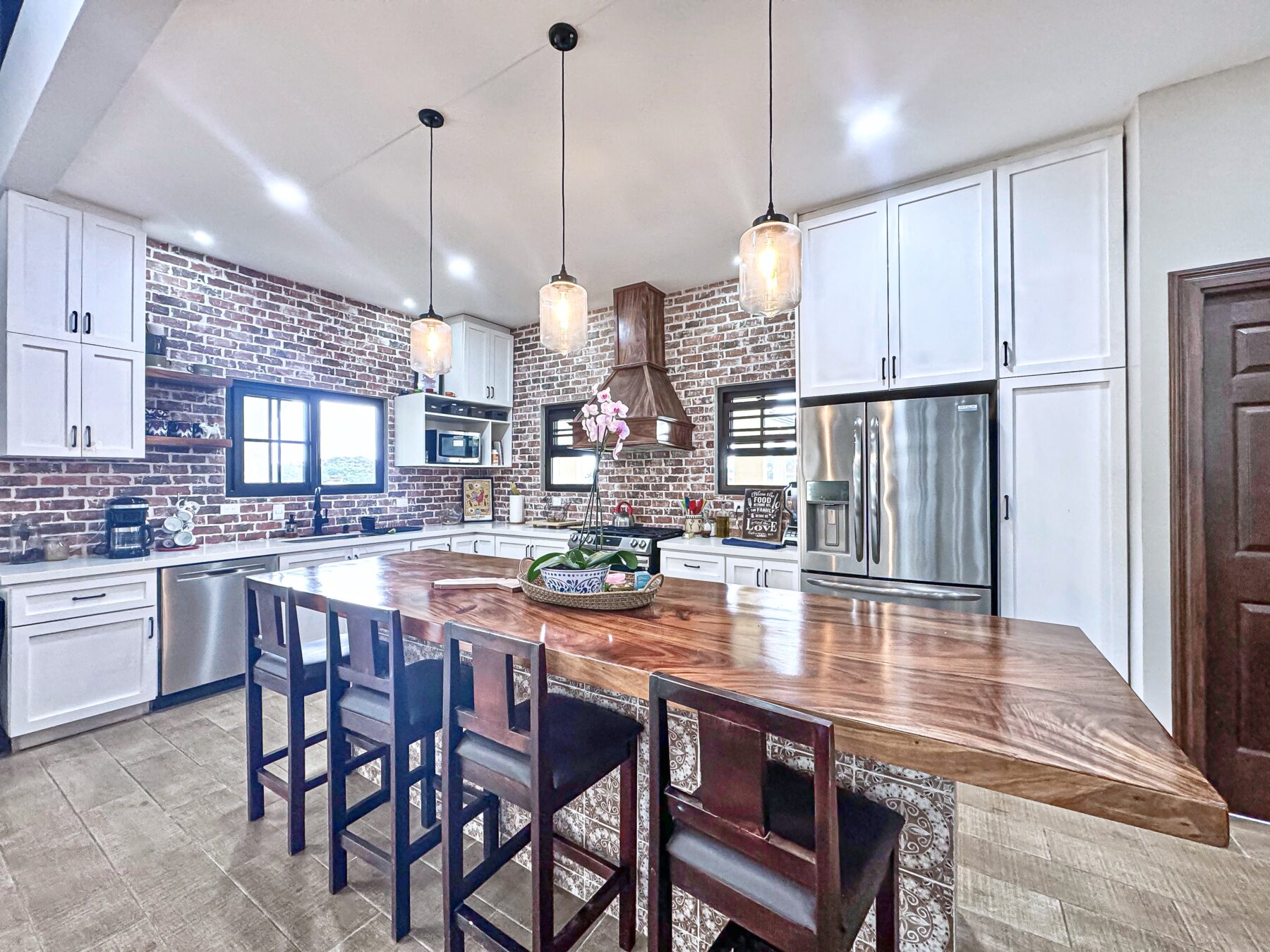 The jaw-dropping kitchen decor is a true centerpiece, boasting modern white cabinetry and classic red brick accent wall & backsplash. At the center of the kitchen, a striking island with a solid Guanacaste wood top is beautifully illuminated by designer pendant lighting—creating a warm, inviting focal point for both cooking and gathering.