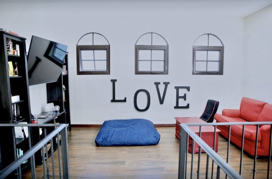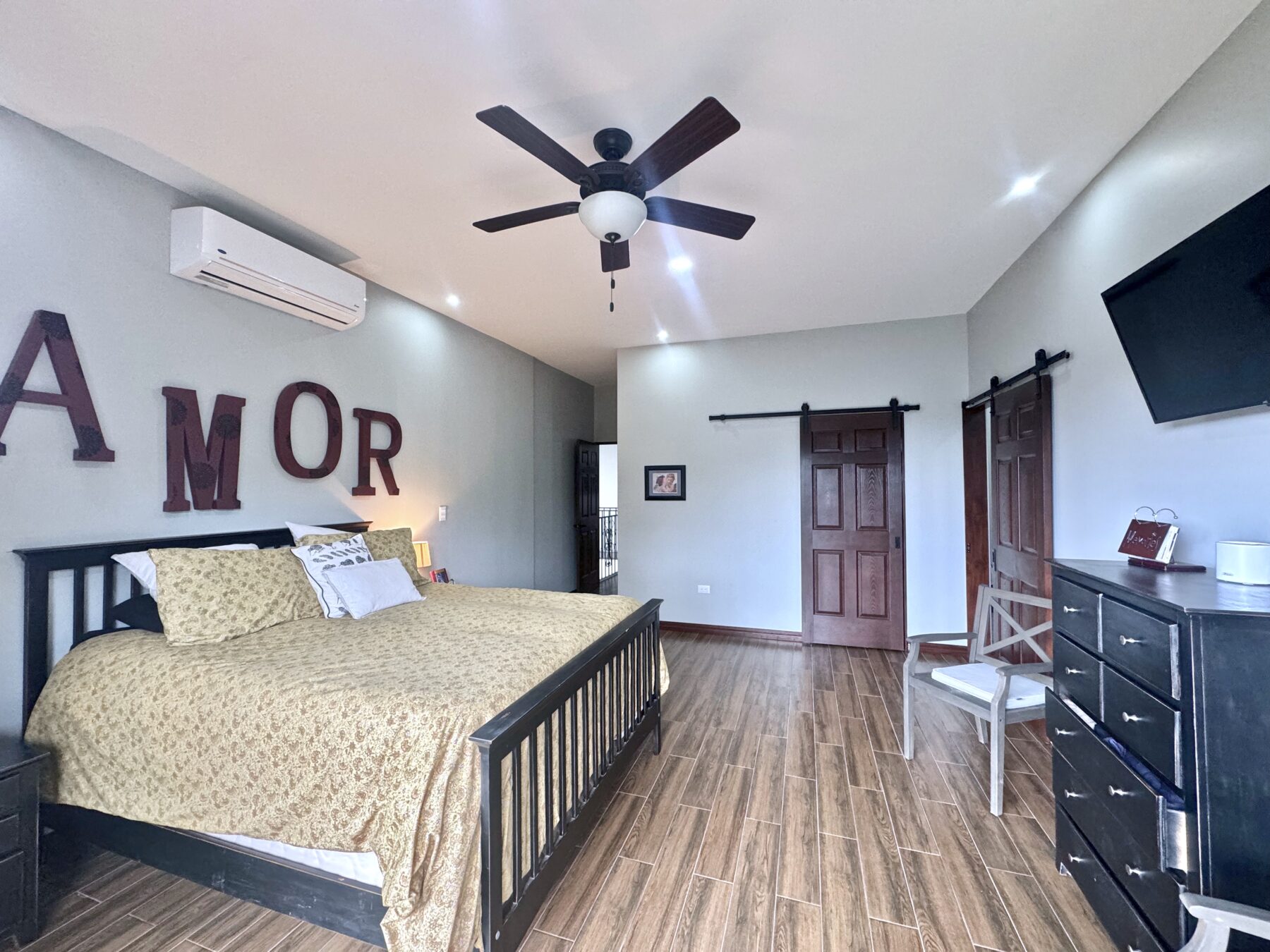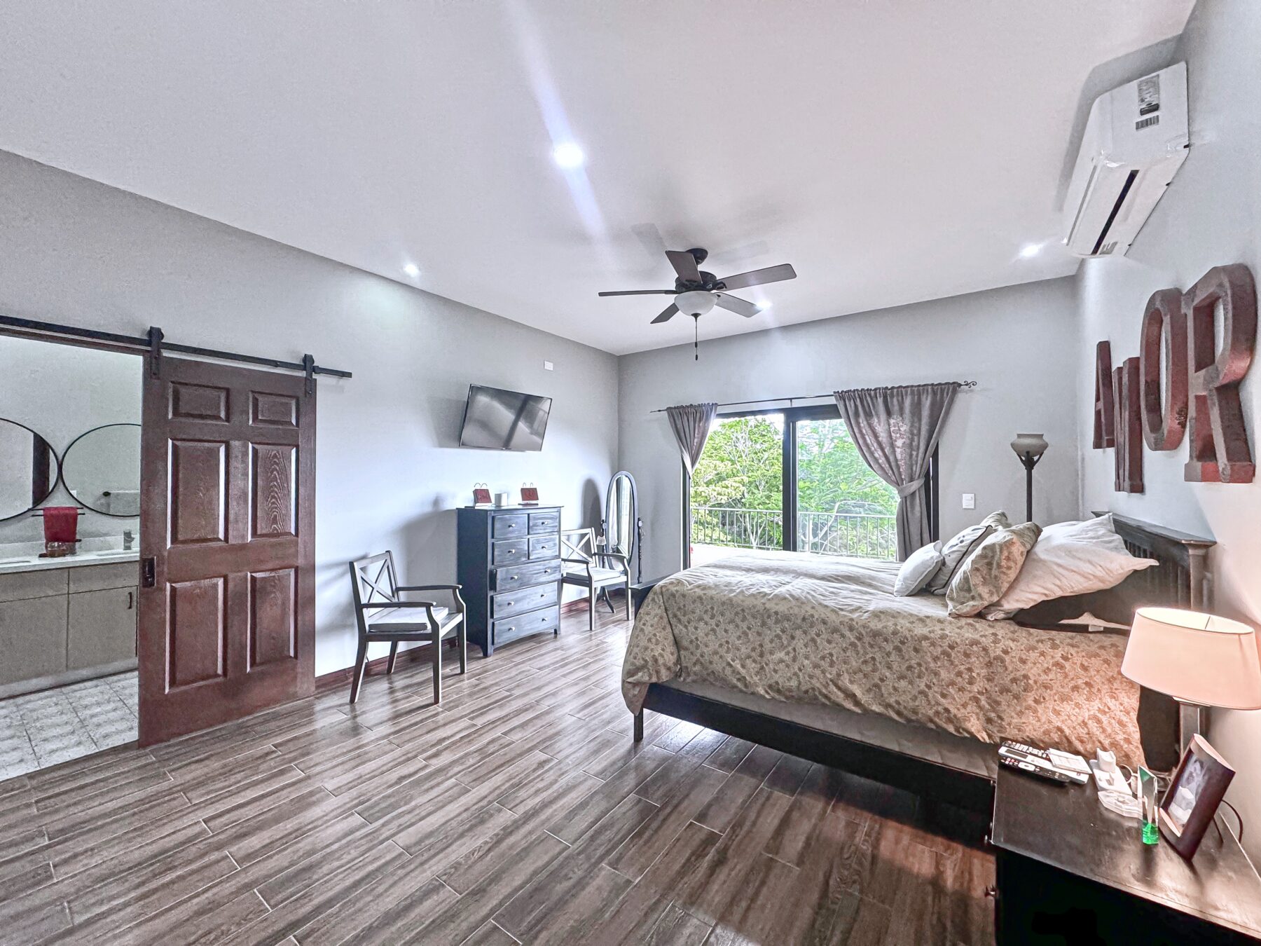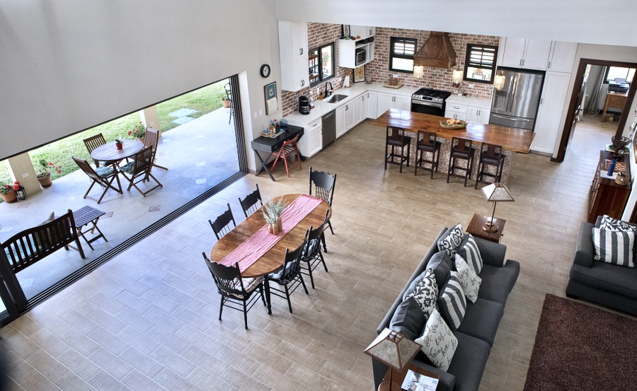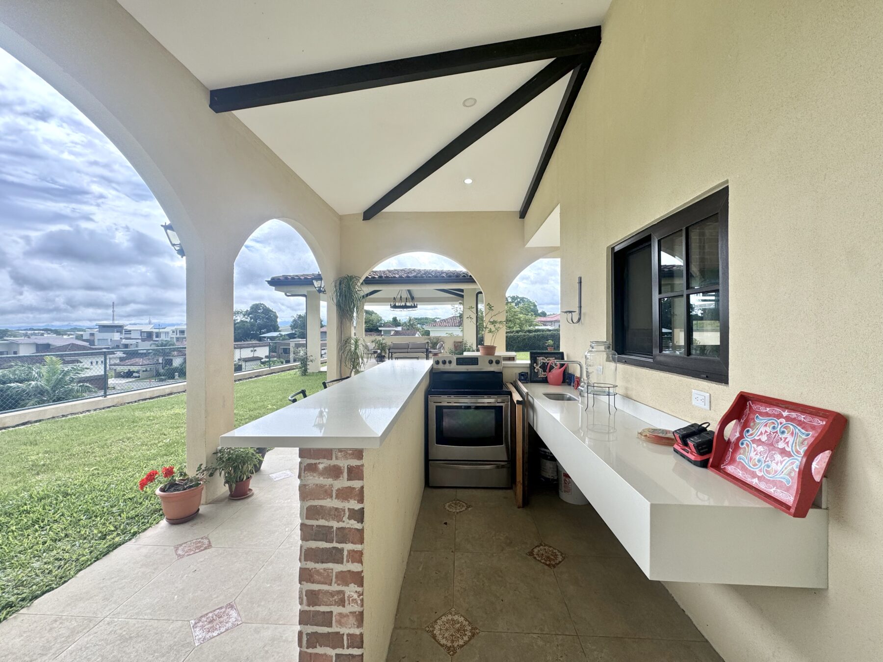 The jaw-dropping kitchen decor is a true centerpiece, boasting modern white cabinetry and classic red brick accent wall & backsplash. At the center of the kitchen, a striking island with a solid Guanacaste wood top is beautifully illuminated by designer pendant lighting—creating a warm, inviting focal point for both cooking and gathering.