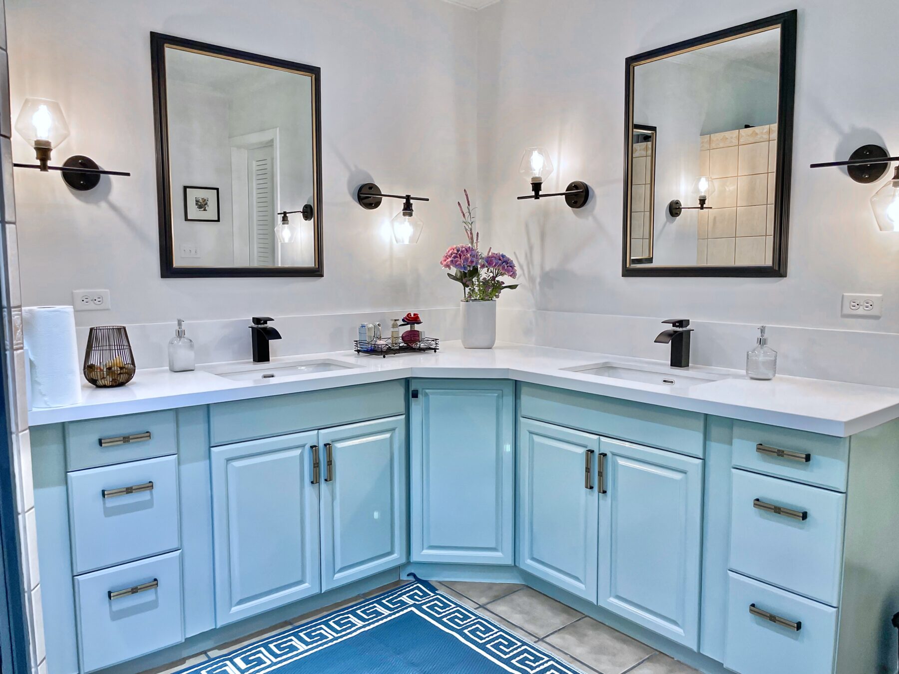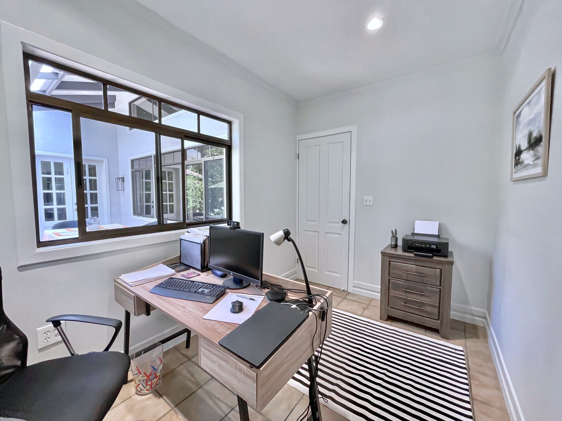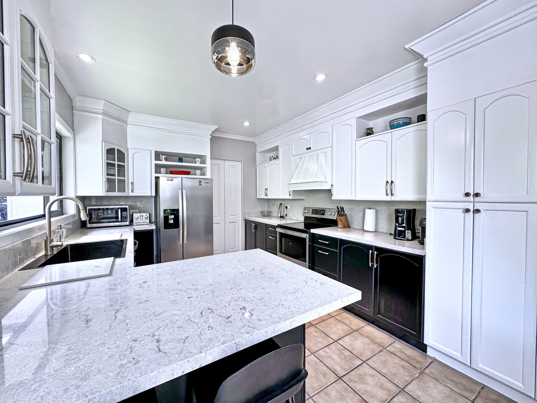 The kitchen is a chef’s delight, featuring refined cabinetry, generous storage, and ample workspace. Stainless steel appliances and quartz countertops complement the room, while large windows overlook the beautifully landscaped gardens and patios.