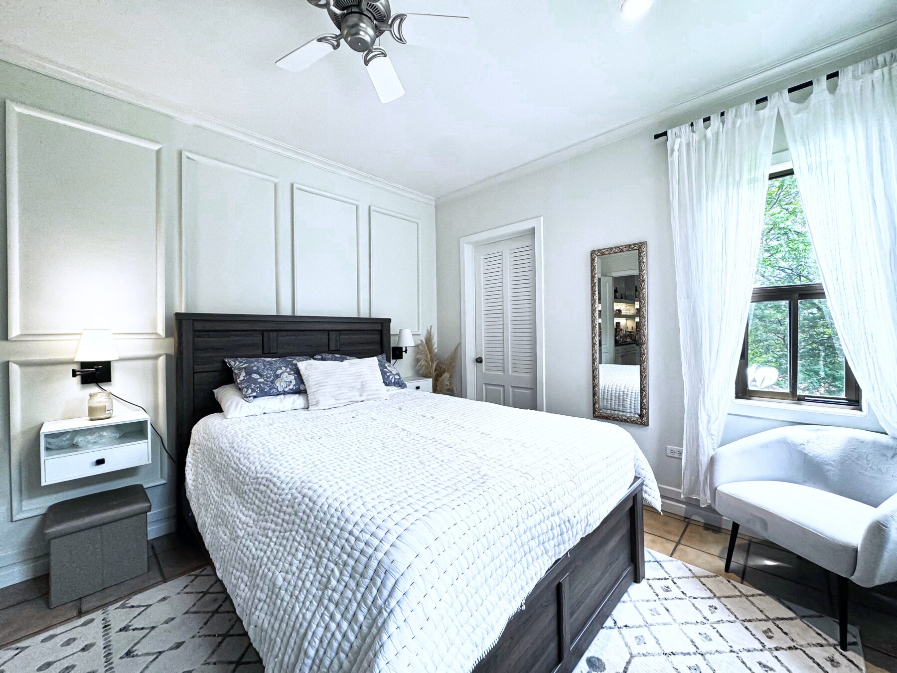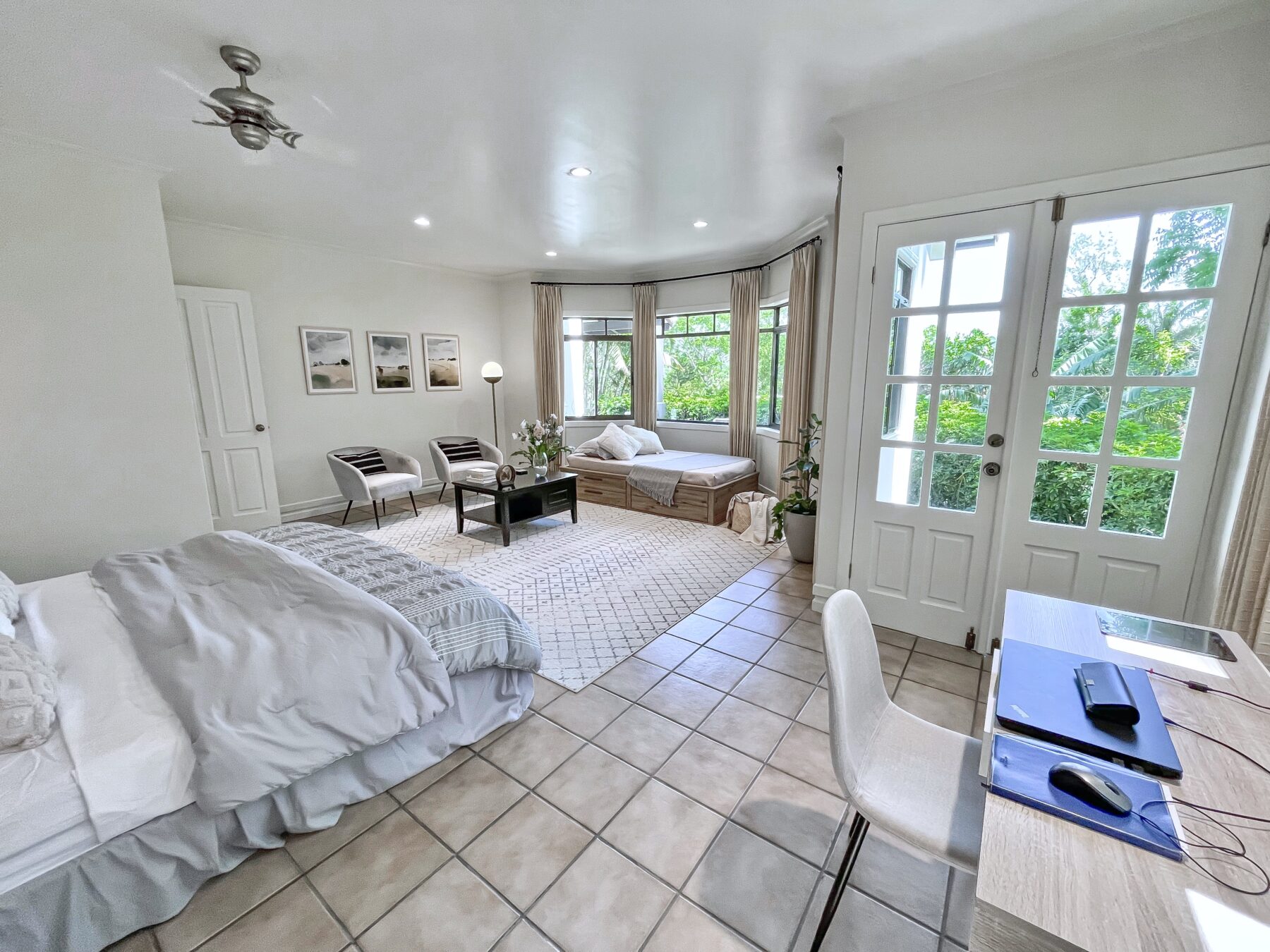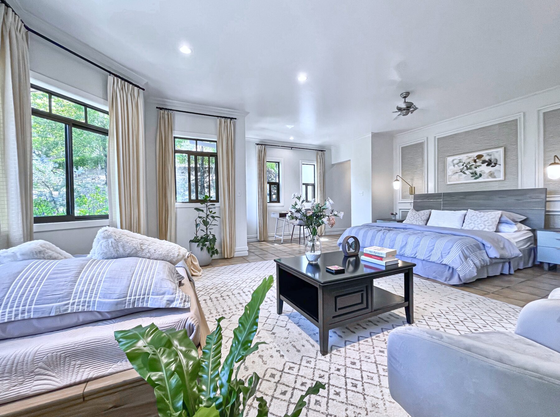 The primary bedroom offers generous space and tranquil garden views, complete with a cozy en-suite lounge area, a walk-in closet, and a luxurious bathroom featuring a bathtub, walk-in shower, and double vanity.