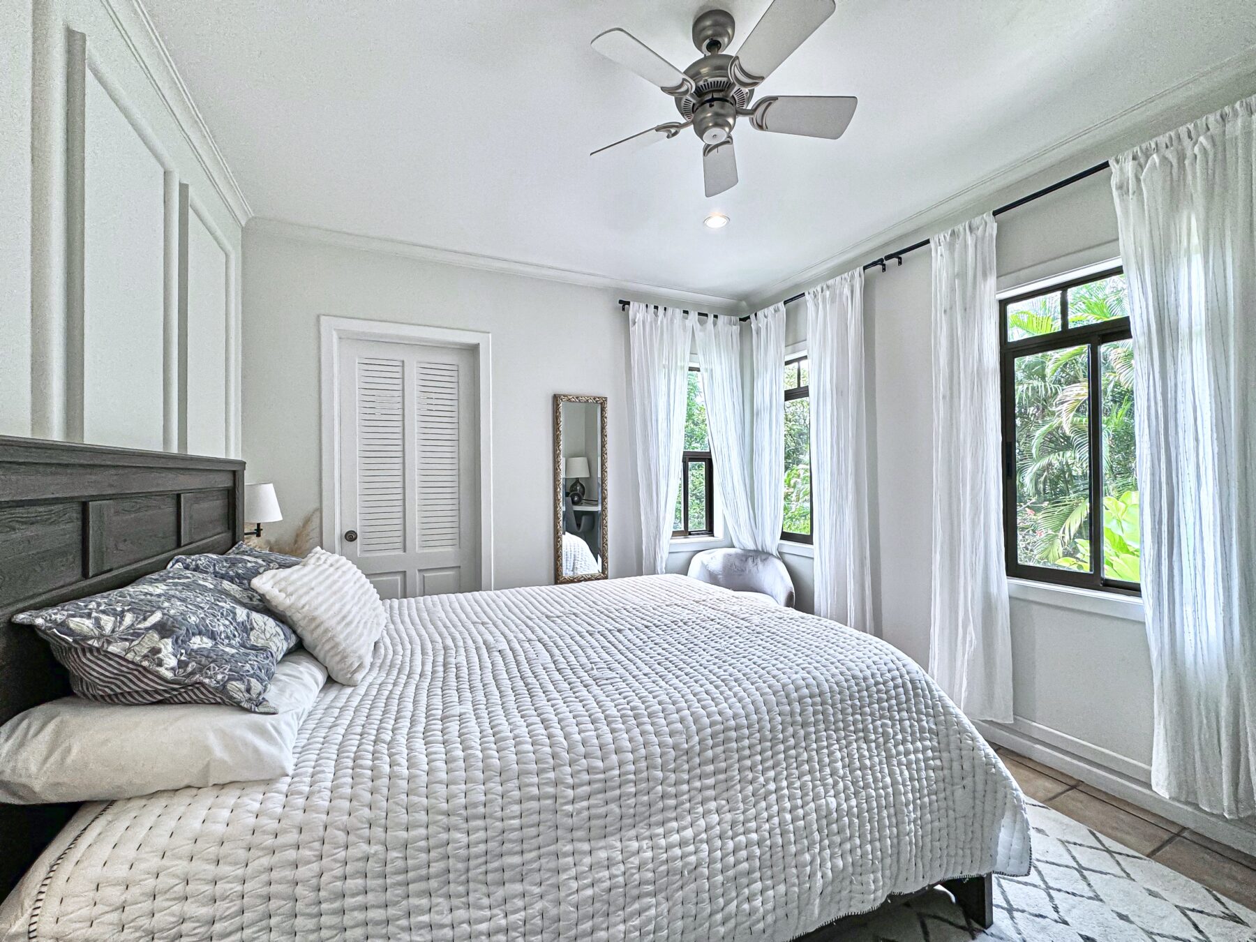 Two additional bedrooms, each overlooking lush gardens, share a well-appointed full bathroom.