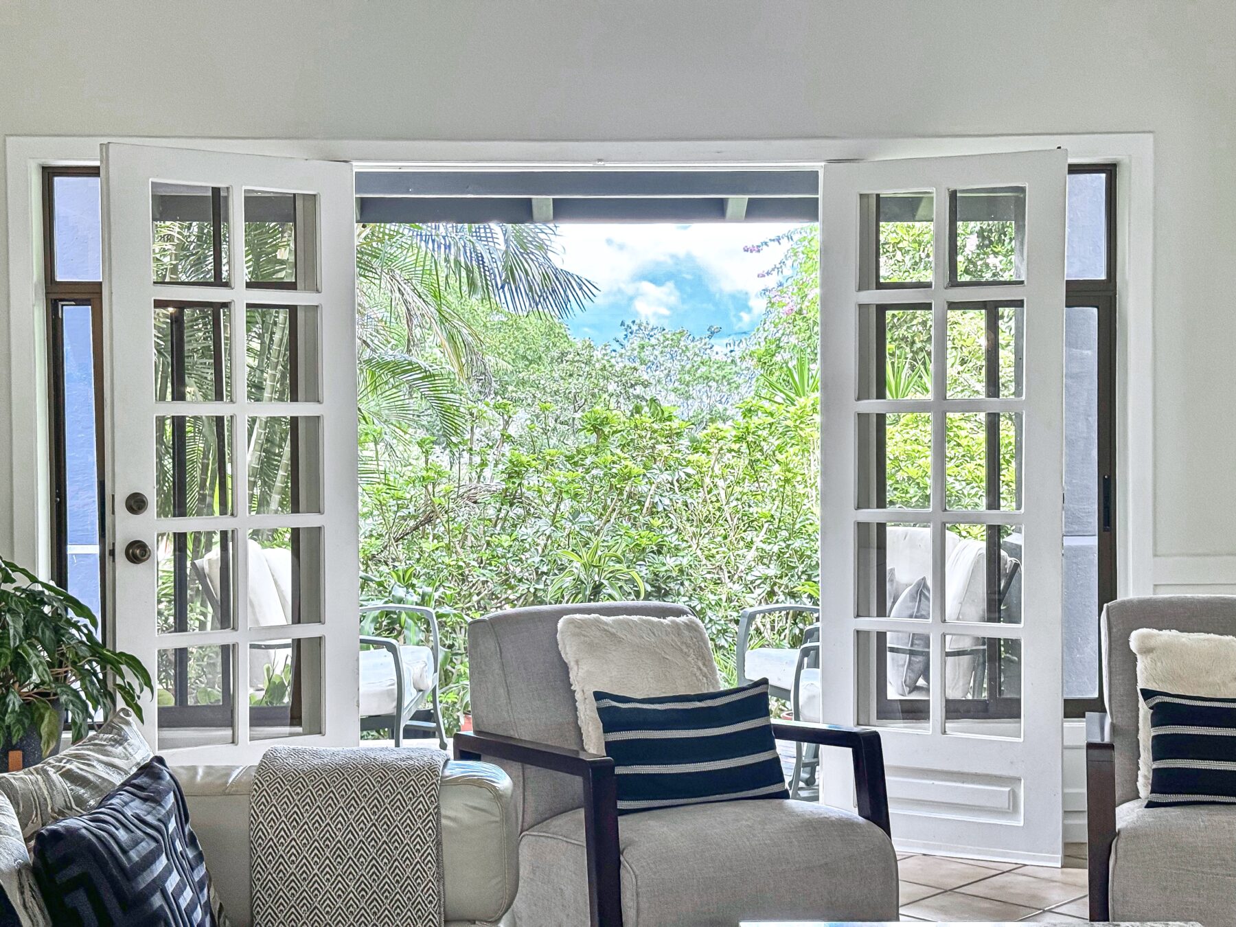 Elegant French Colonial doors open onto expansive covered patios at both the front and rear of the home—ideal spots to unwind or entertain while soaking in the sounds of nature, serene views of mature trees and rolling mountains. Whether dining al fresco or lounging with a favorite drink, these outdoor spaces offer a perfect retreat.