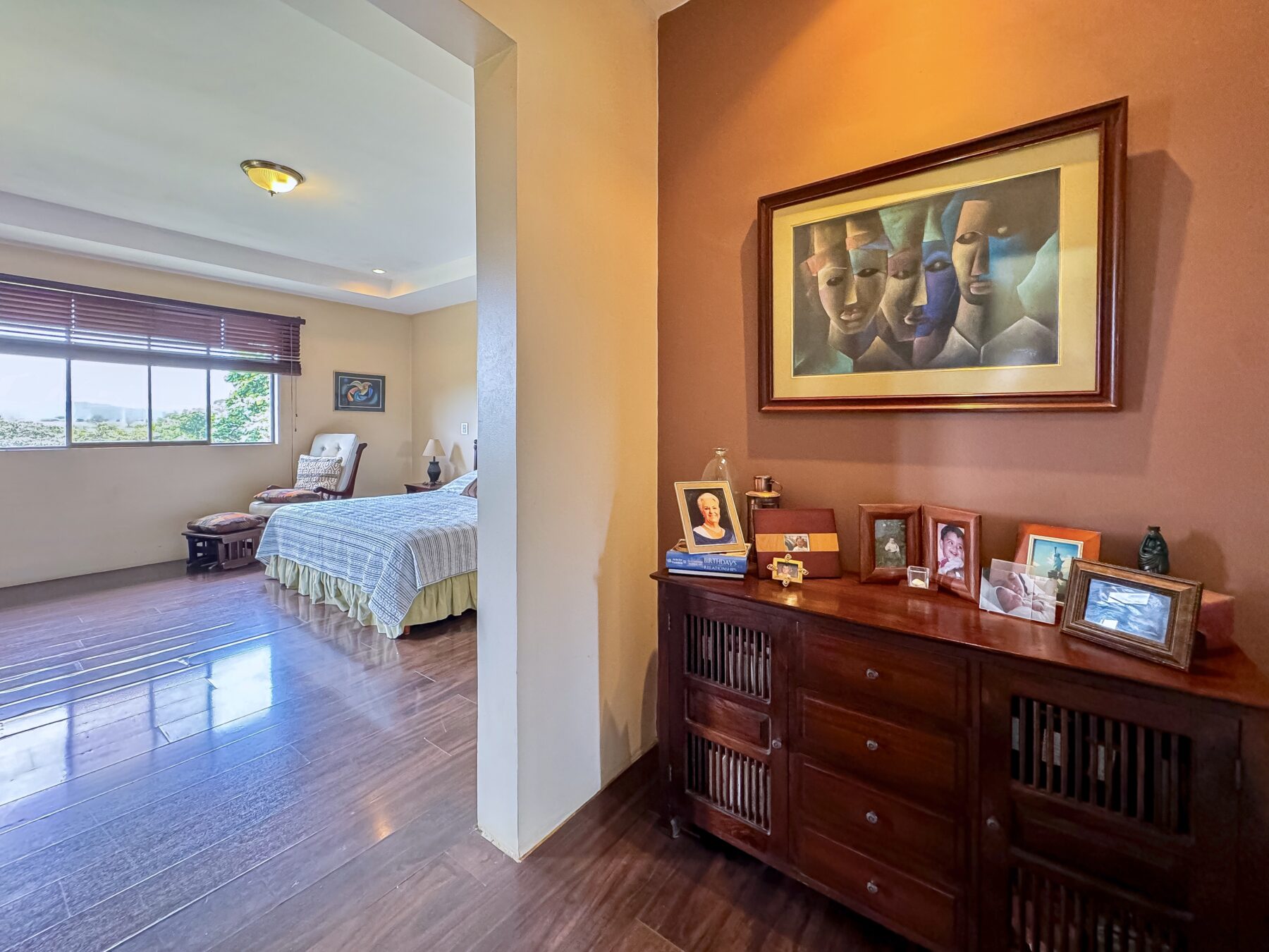 Un pasillo privado te conduce al espacioso dormitorio principal, ofreciendo un refugio tranquilo del resto de la casa. El pasillo cuenta con un balcón donde podrás relajarte en paz, perfecto para momentos de reflexión o para disfrutar de una bebida favorita. Dentro, el dormitorio principal es lo suficientemente grande para acomodar una cama king-size, una zona de estar acogedora y más. Un encantador balcón “Romeo y Julieta” extiende la habitación hacia el exterior, con vistas a los jardines y permitiendo que la brisa fresca fluya mientras observas los hermosos paisajes.