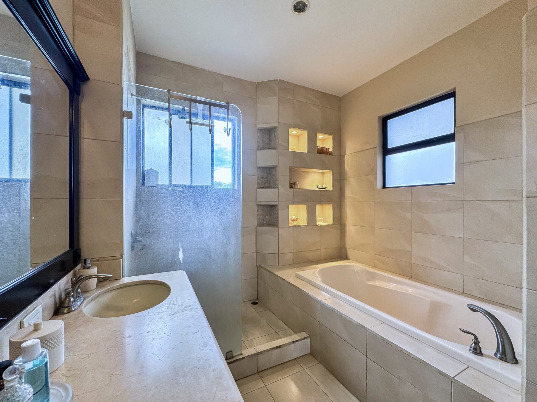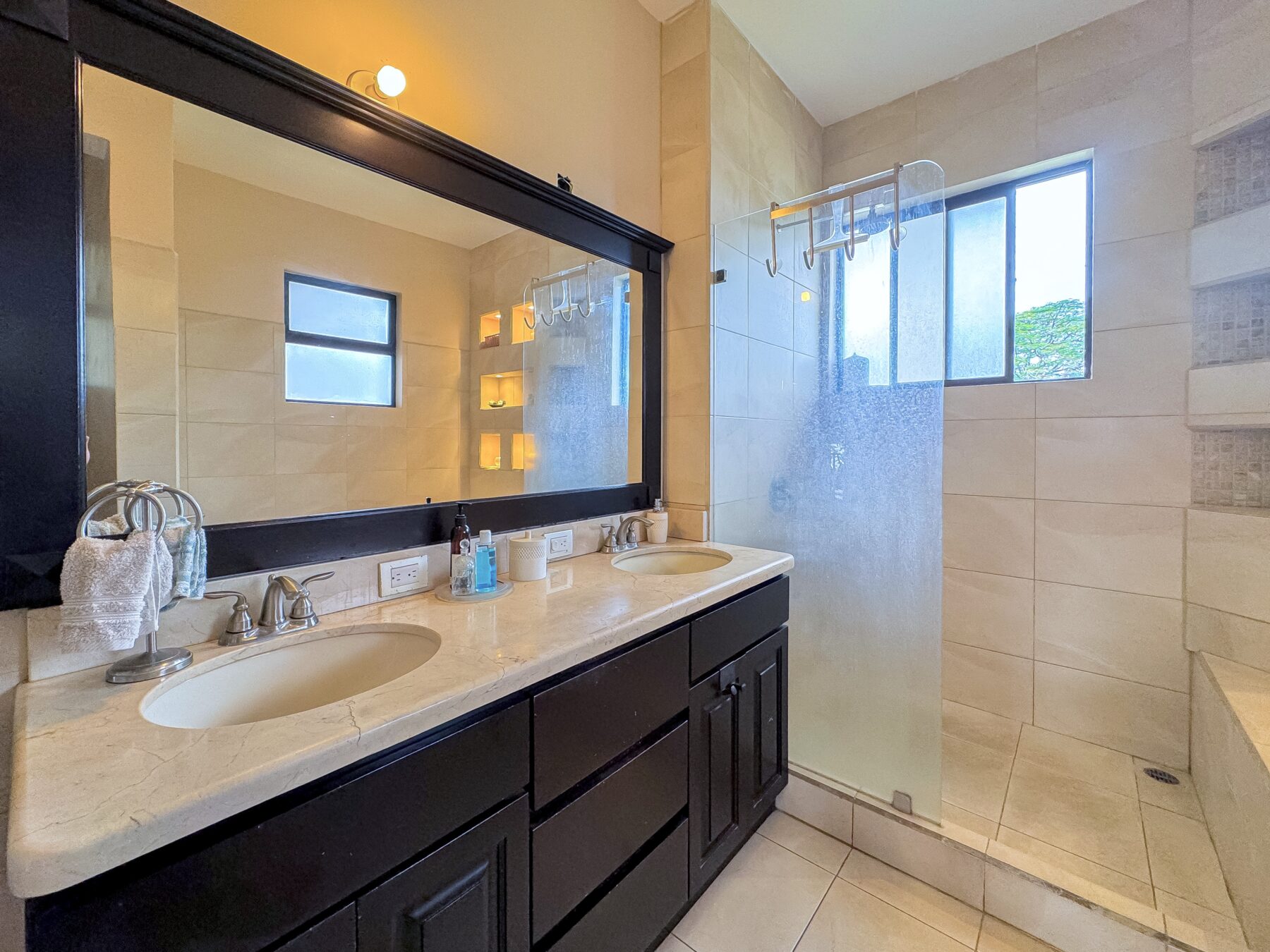 El baño en suite es tu oasis personal, con bañera, lavabo doble y un walk – in closet, además de un balcón—todo lo que necesitas para relajarte y renovarte.