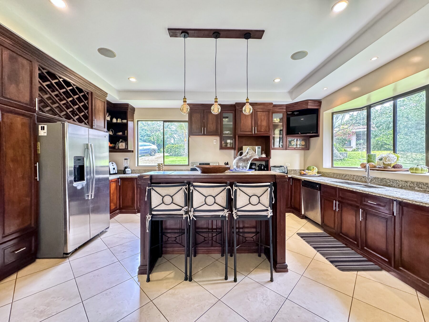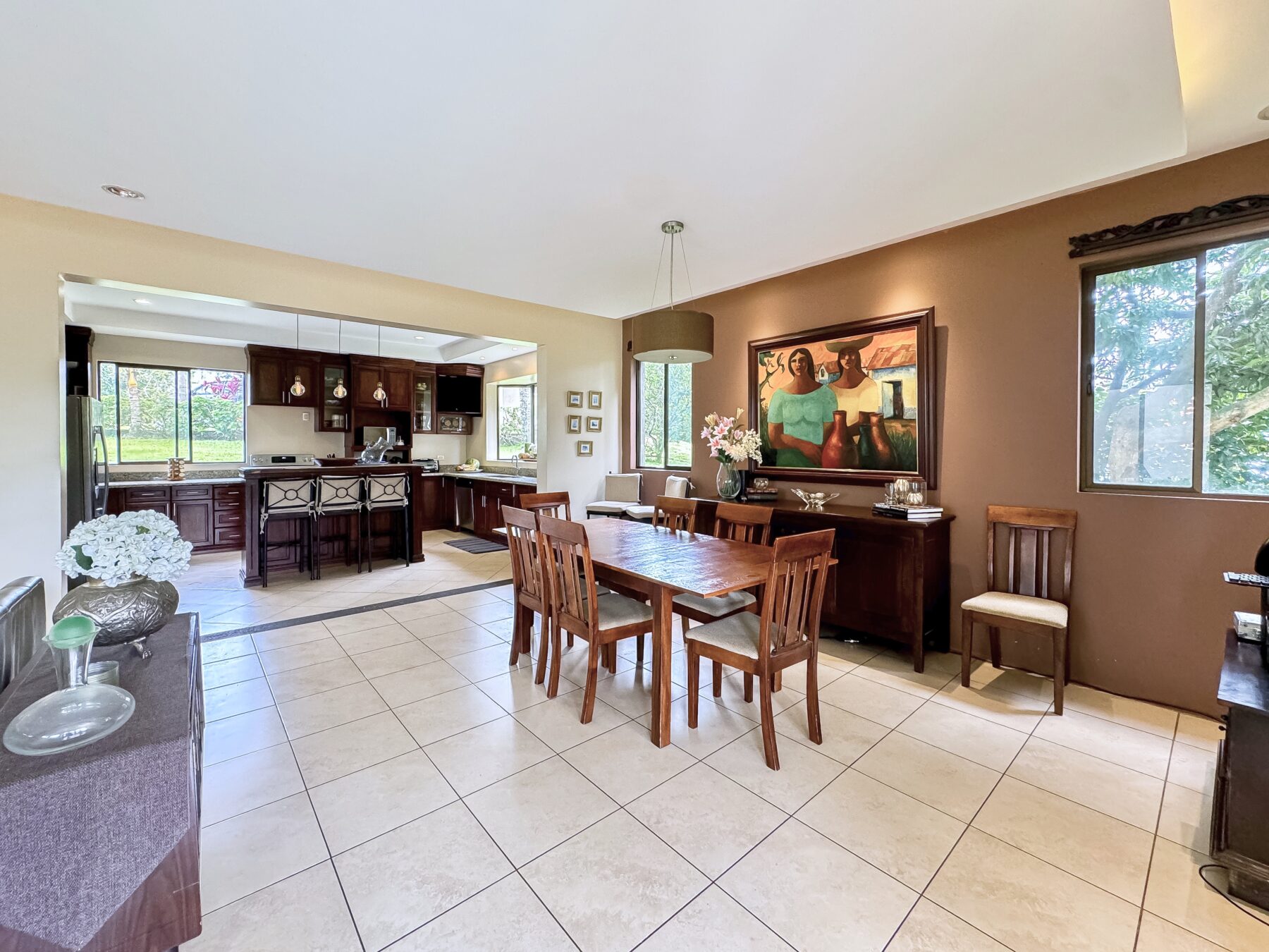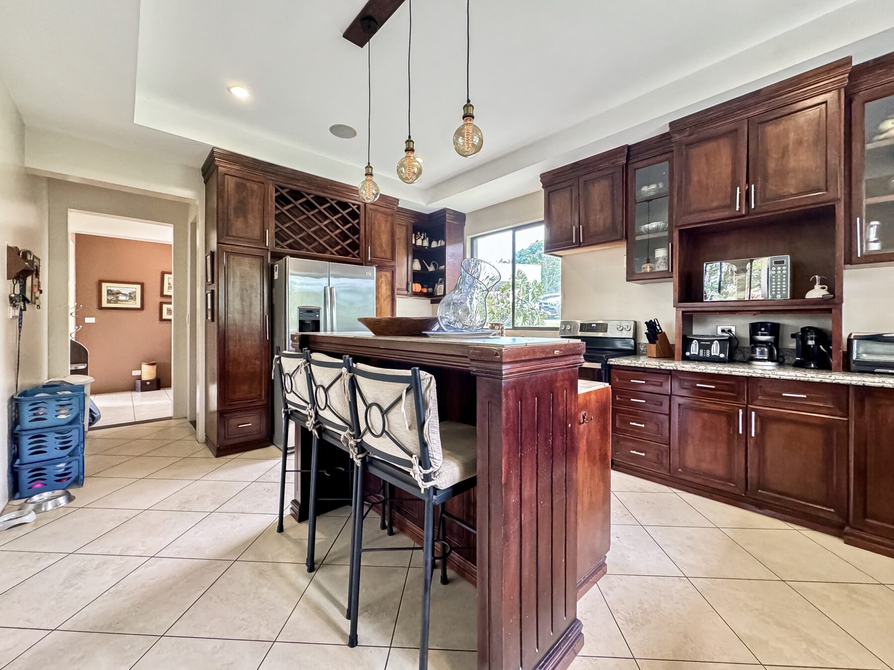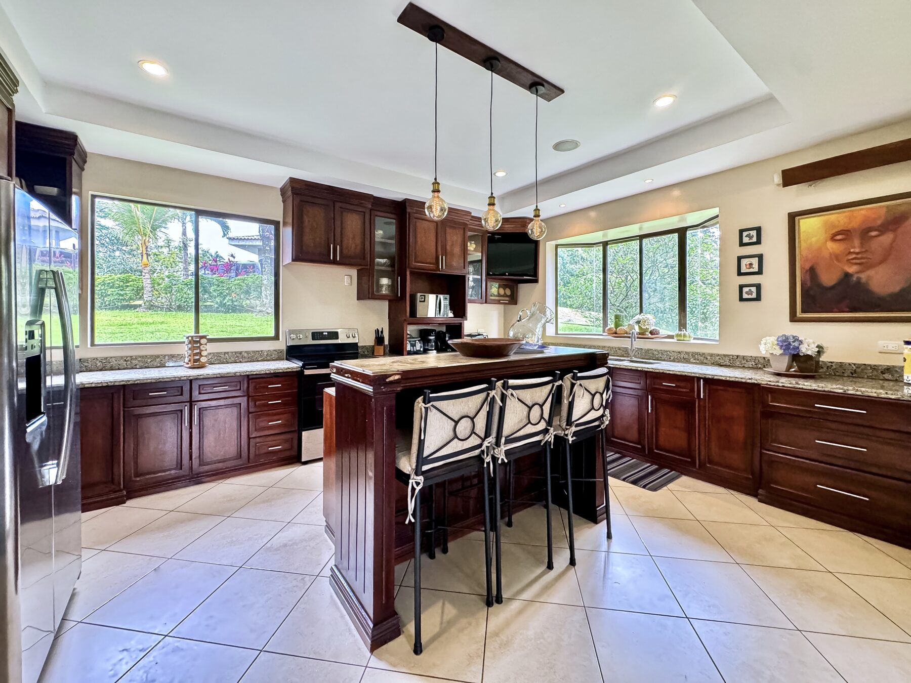 Para quienes disfrutan de cocinar y entretener, esta cocina es un sueño hecho realidad. Ofrece gran capacidad de almacenamiento y amplias superficies de trabajo, perfectas para la preparación de alimentos o comidas informales. La cocina está equipada con electrodomésticos de acero inoxidable y encimeras de granito. En el centro de la cocina, una elegante isla está bellamente iluminada con lámparas colgantes de diseño, lo que la convierte en el lugar perfecto para comidas casuales o para reunirse con amigos y familiares.