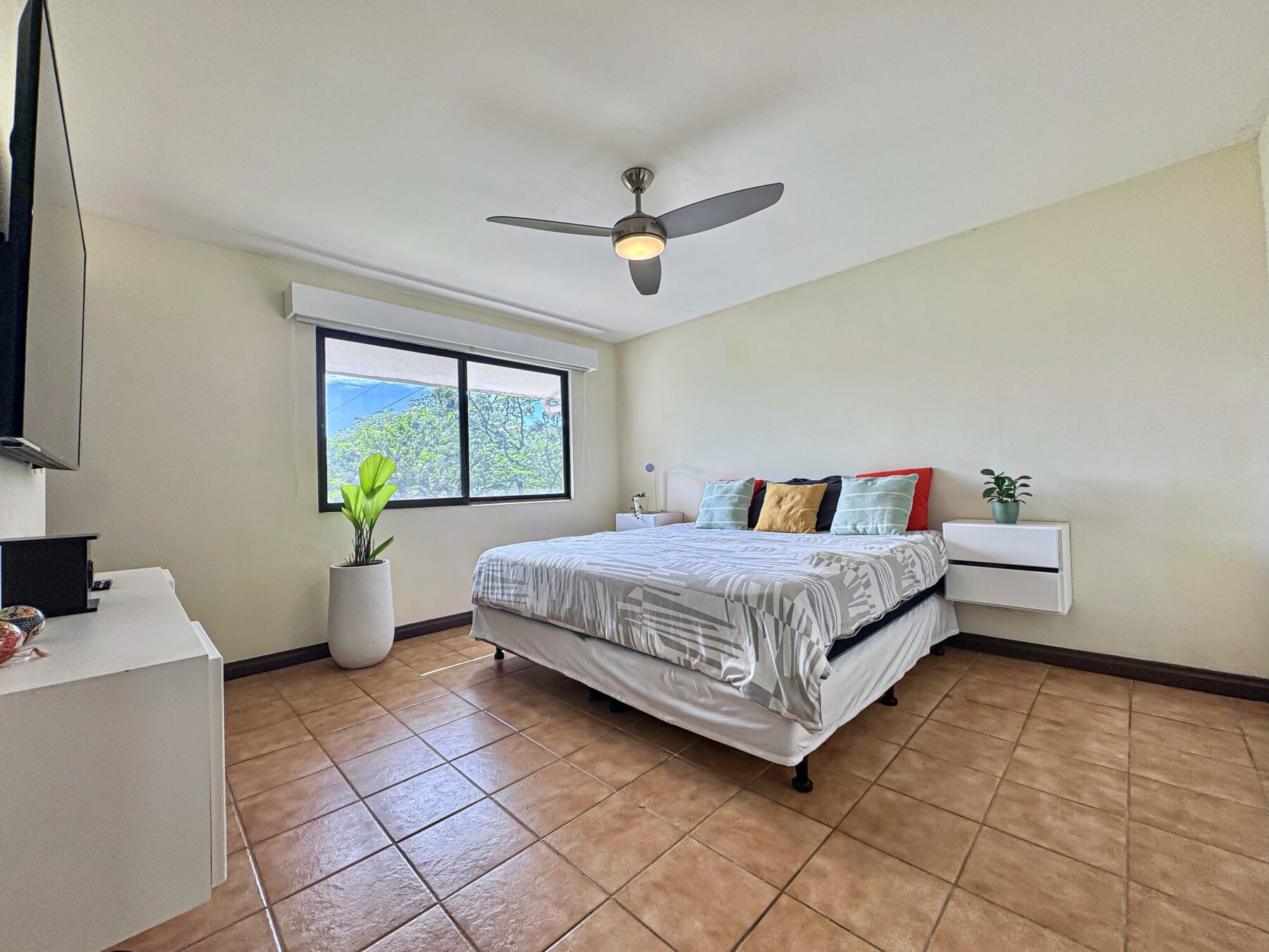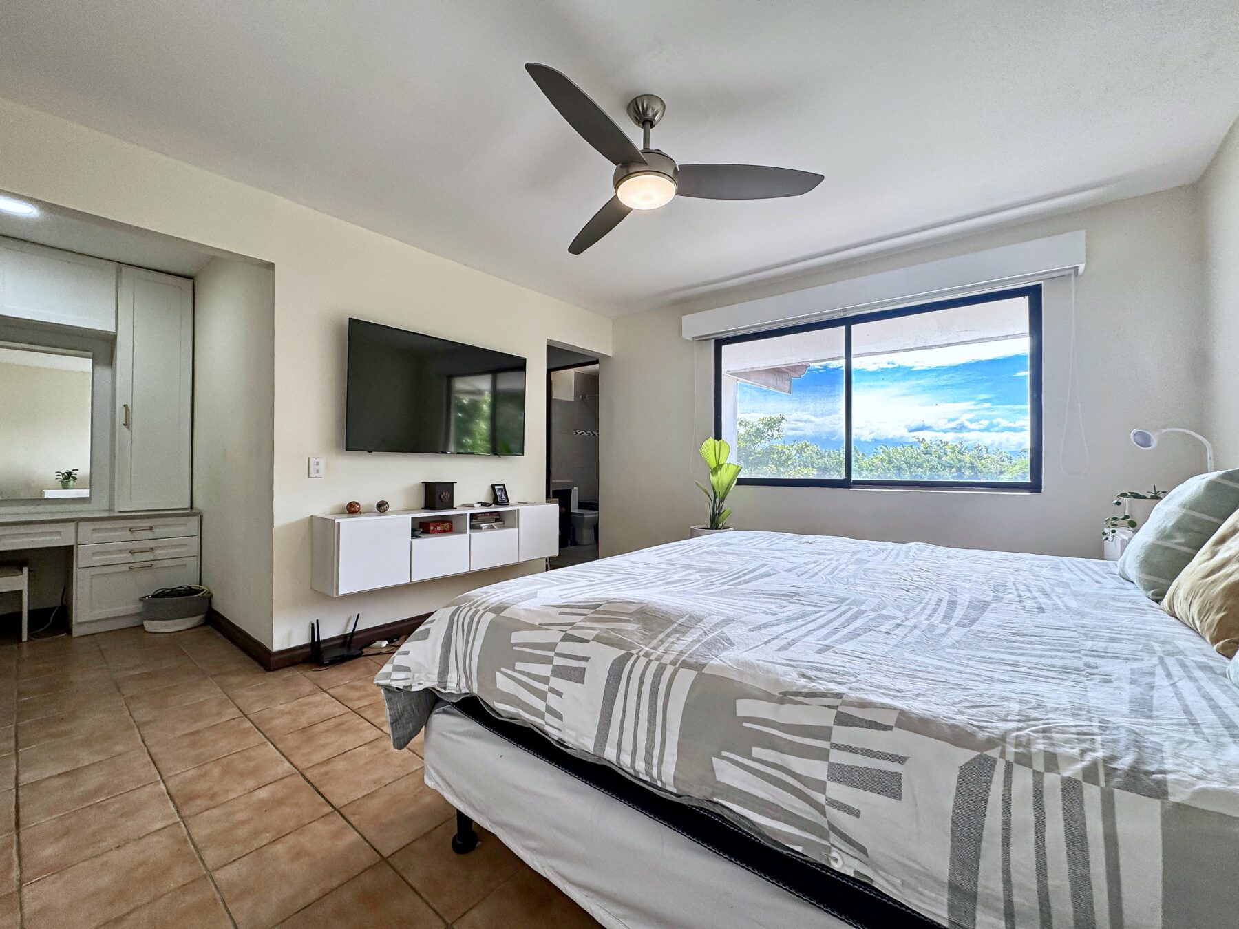 From the stairs leads to the sleeping quarters. The Priamry Bedroom boasts views of the Heredia mountain range, make up vanity, ample space for a king bedroom set, a spacious walk-in closet, and an en-suite bathroom with a tub & shower. The secondary bedroom boast garden views and an en-suite bathroom.
