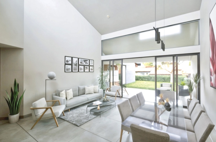 The home features an open-concept layout that seamlessly connects the kitchen, dining, and living areas with the sleeping quarters and outdoor gardens. The living room boasts high ceilings, abundant natural light, and wall-to-wall sliding glass doors that open directly onto the patio and yard, creating a perfect indoor-outdoor living experience.