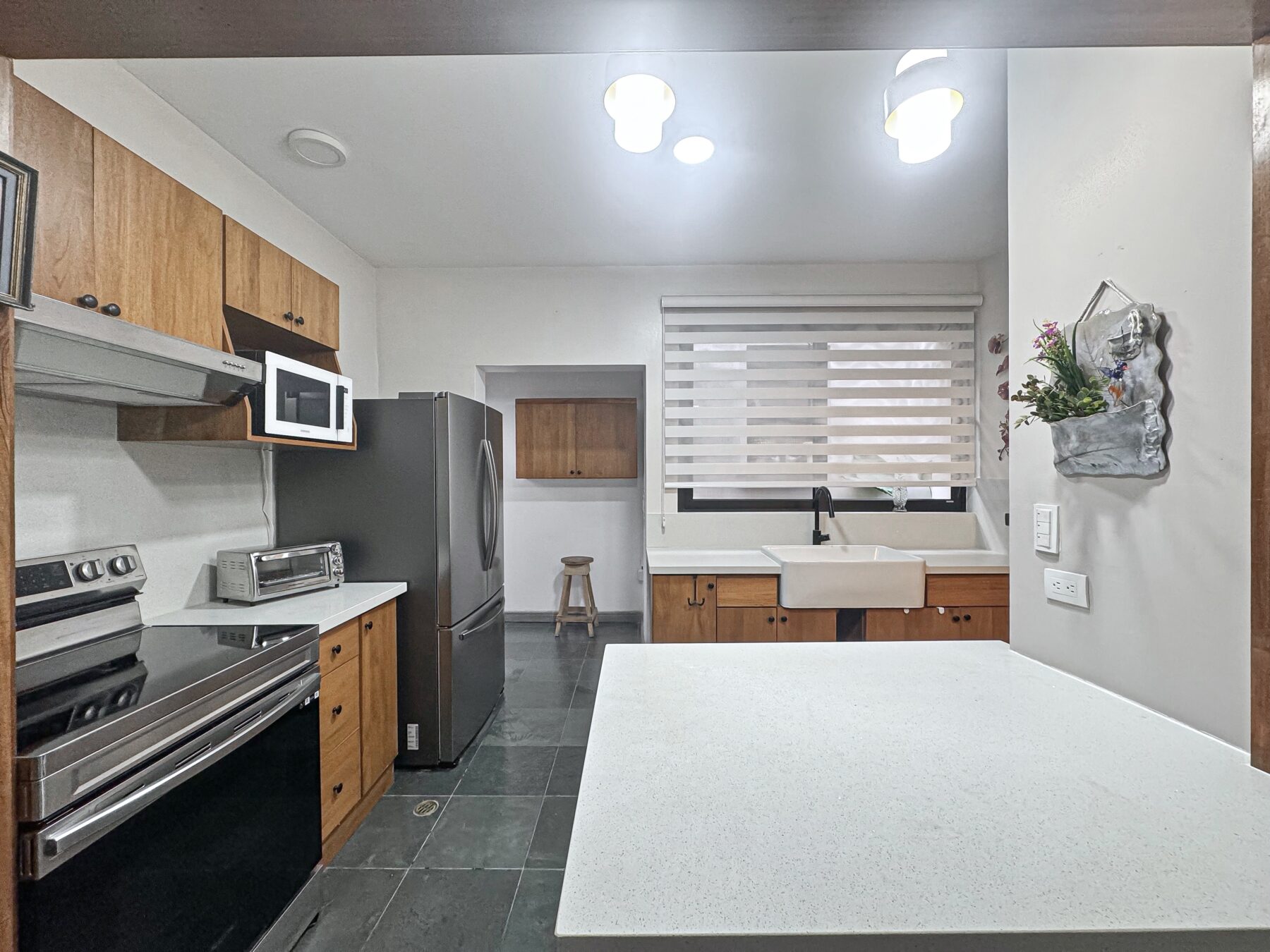 The kitchen is a true delight — equipped with stainless steel appliances, a walk-in pantry, porcelain farmhouse sink, and white quartz countertops paired with warm wood cabinetry and modern black fixtures.