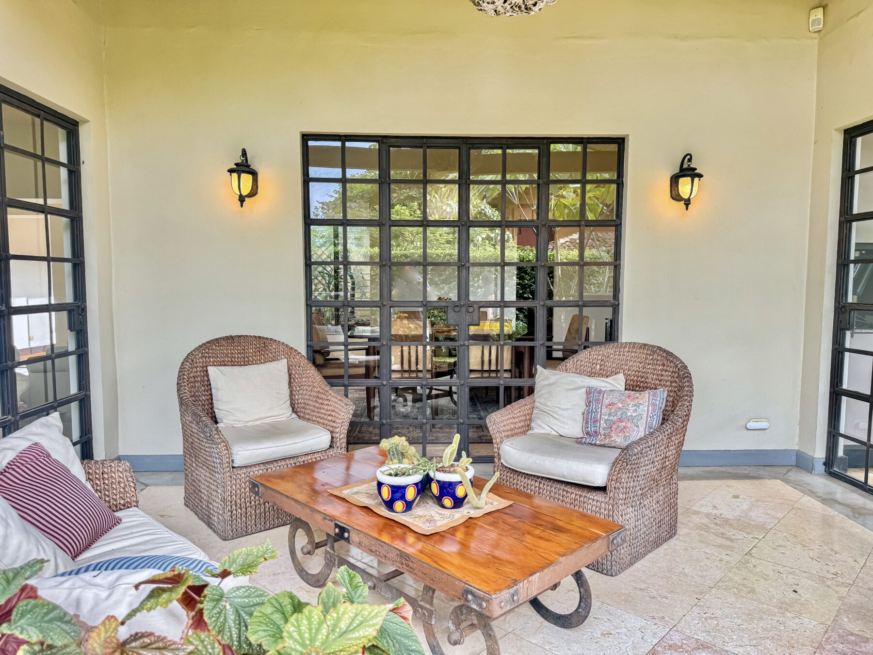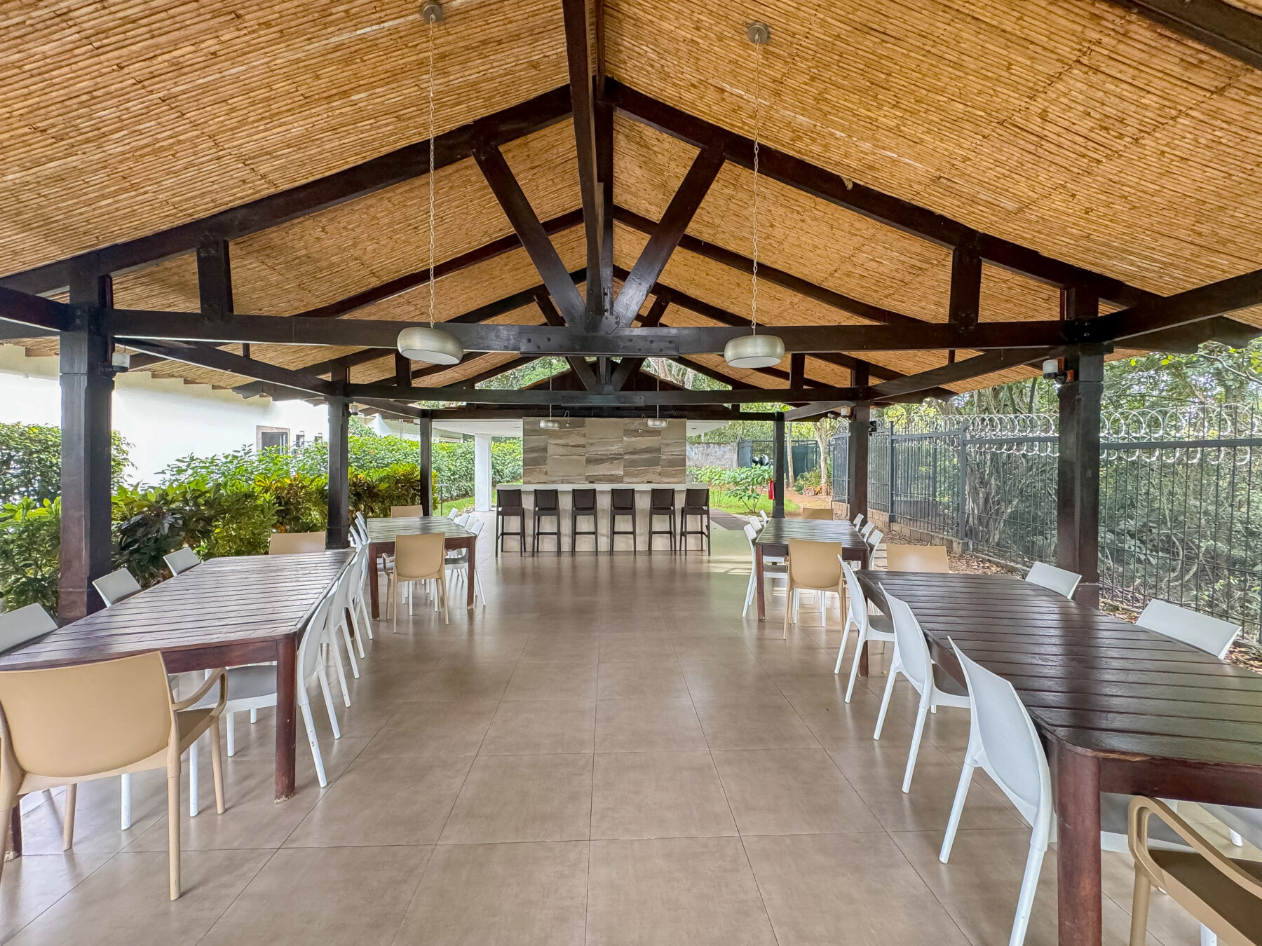 • Large covered patio with cana brava ceiling finishes. This area is perfect for entertaining or lounging with family and friends. Lots of sitting and lounging space.