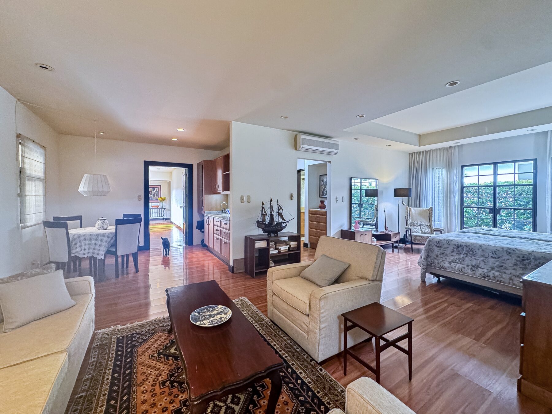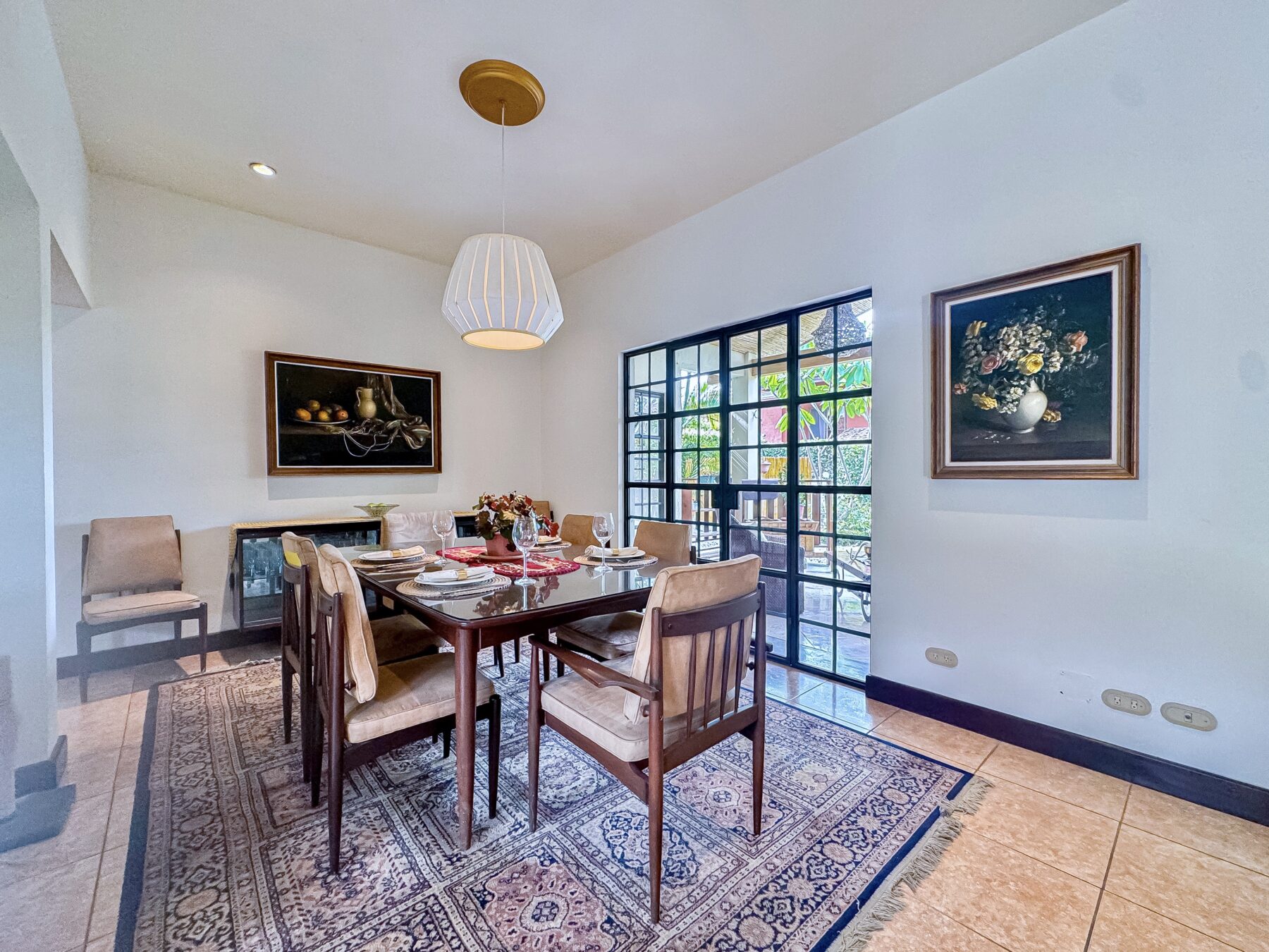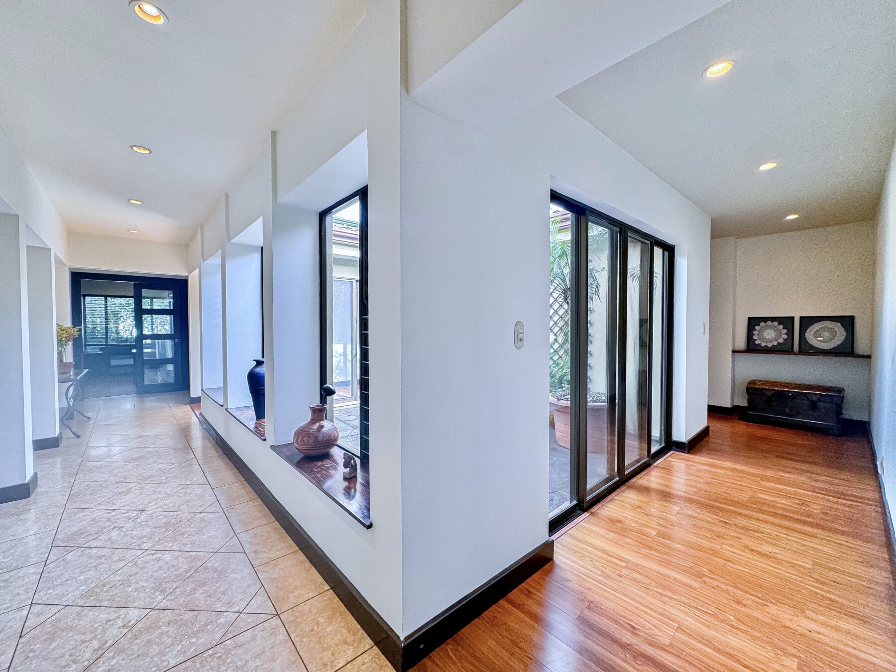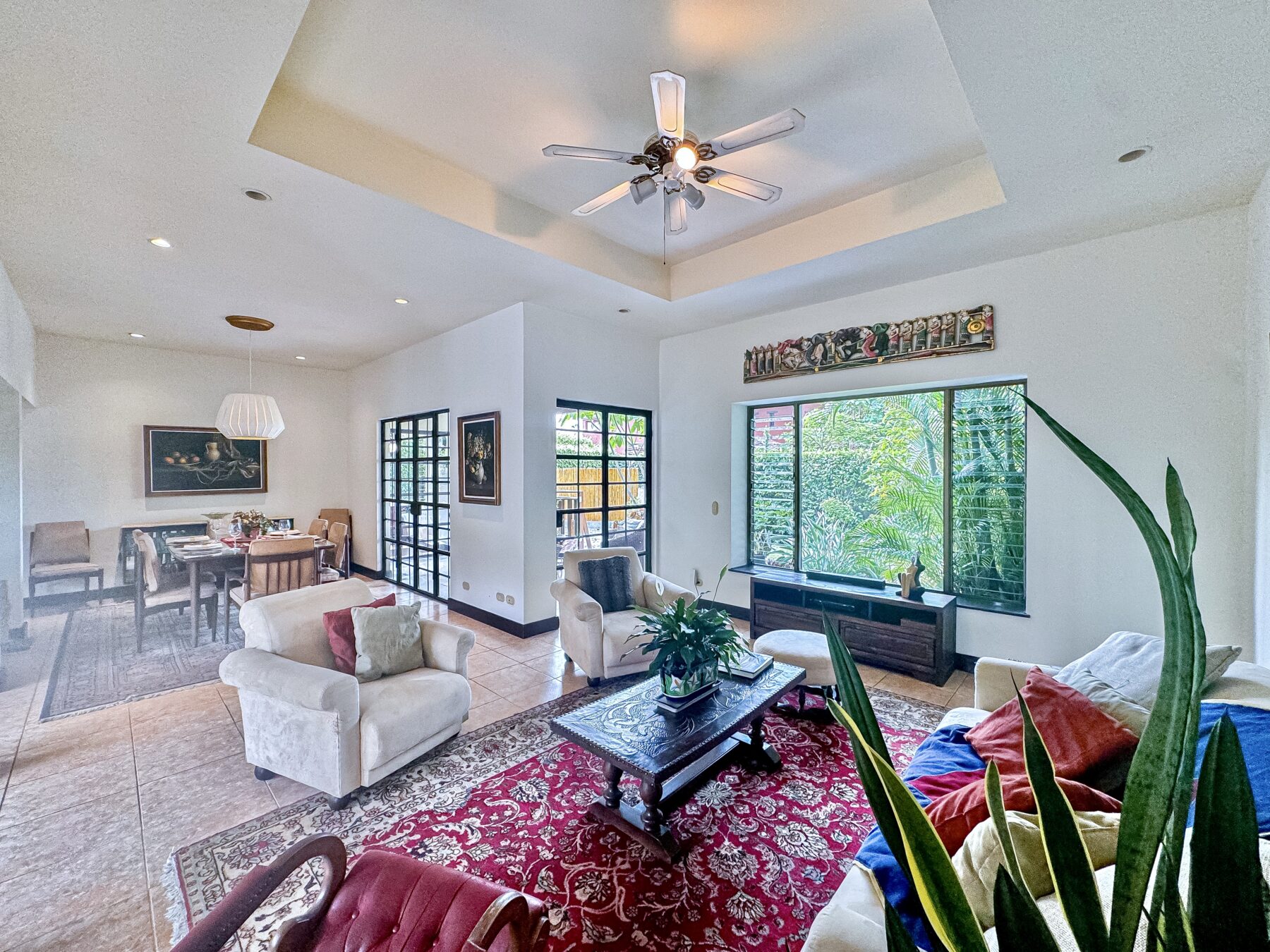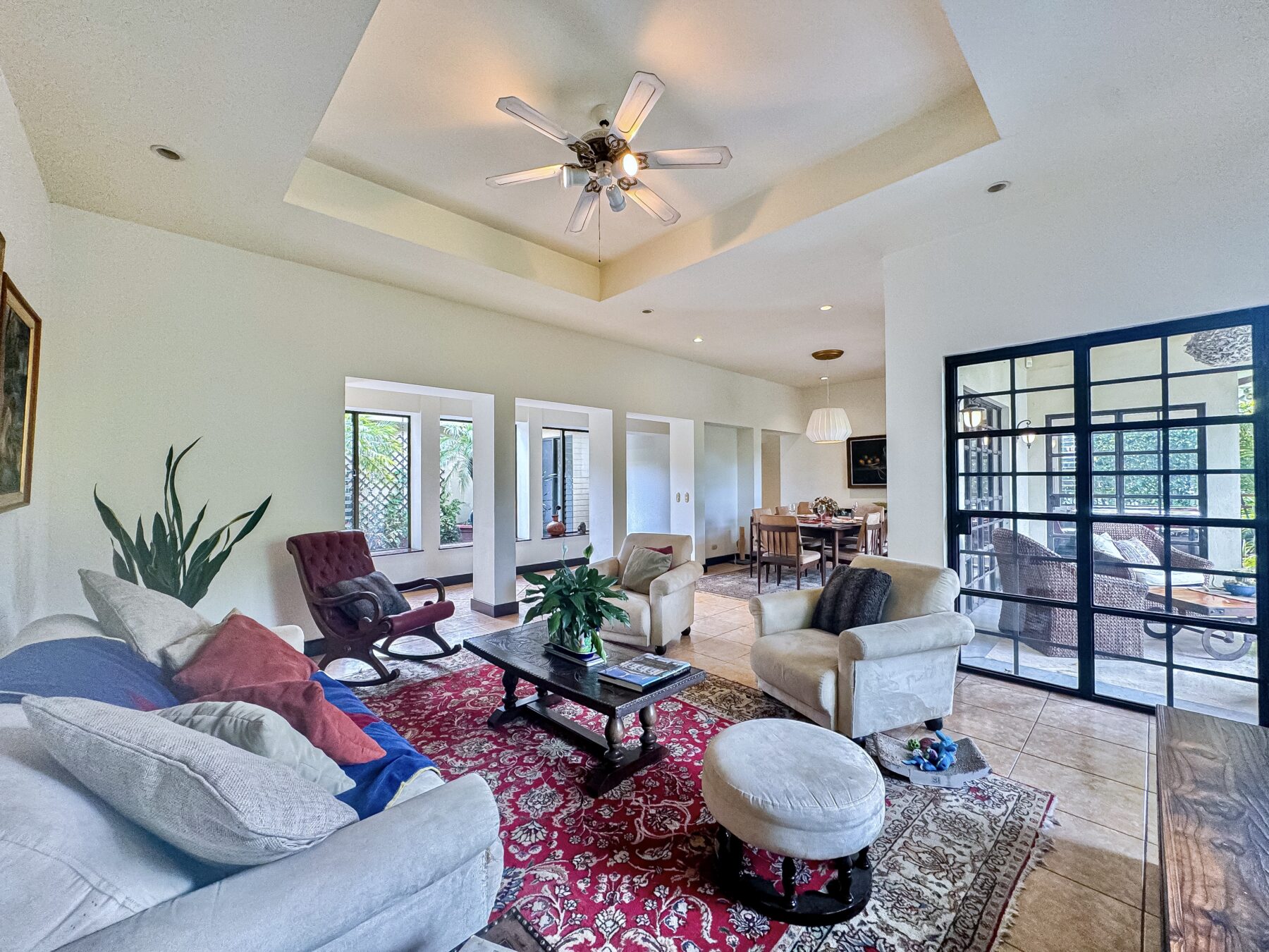 Step into a welcoming foyer that opens into a tranquil closed courtyard, where gardens create a stunning focal point. From here, the home gracefully flows into the formal living, dining areas, and sleeping quarters, all thoughtfully connected for fluid living. French glass folding doors open to the covered patio and lush backyard with an exotic garden– the perfect indoor-outdoor living experience, whether you’re sipping morning coffee, hosting a dinner party, or simply unwinding.